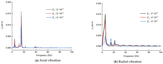 Vibration velocity in axial and radial directions in the frequency domain under Es/E = 10−3 − 10−1.