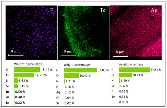 The MP surfaces were detected using an energy spectrometer (S-3400N) and found to be enriched in elements such as aluminum (Al) and iron (Fe) and halogens such as fluorine (F), chlorine (Cl), bromine (Br), and iodine (I), as well as metalloids and transition metals such as tellurium (Te) and silver (Ag), and the basic constituent elements of the material, such as carbon (C), oxygen (O), nitrogen (N), and silicon (Si) (Figure 3). Fluorine is a key element in special plastics, rubber, and other highly oxidizable products. Bromine and its compounds can be used as insecticides and dyes, while chlorinated compounds are chemically active and toxic. Various elements enriched on the surface of microplastics (MPs) participate in different environmental processes within water bodies and sediments.