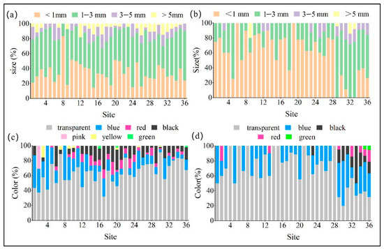 Particle size and color composition of MPs in surface water (a,c) and sediment (b,d) of LCH.