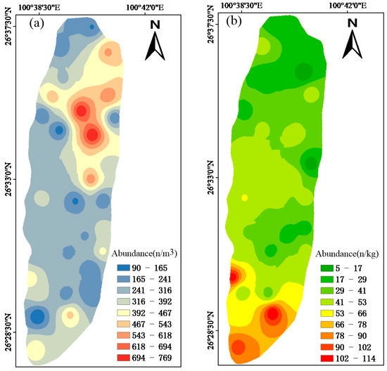 The abundance and spatial distribution of the MPs in LCH; (a) surface water; (b) sediment.