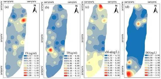 The water quality parameters of the surface water in LCH; (a) total nitrogen (TN); (b) total phosphorus; (c) chlorophyll a (Chl-a); and (d) dissolved oxygen (DO).