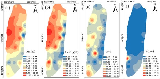 The physicochemical parameters in the surface sediment of LCH; (a) organic matter (OM); (b) carbonate (CaCO3); (c) ratio of carbon to nitrogen; and (d) median size (d).