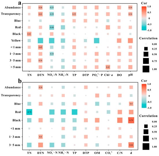 Relationship between environmental factors and MPs in LCH; (a) water quality parameters with MPs in surface water; (b) physicochemical indexes with MPs in surface sediment.