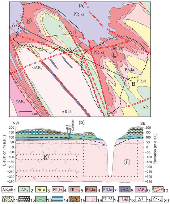 (a) Geological map of the basement of the region under investigation and (b) schematic geologic cross-section along the line A–B. Legend to the map (1–10): 1–9—formations: 1–2—Archean: 1—lower, 2—upper; 3–7—Lower Proterozoic: 3–7—Kursk series: 3—Stoilenskaya suite, 4–7—Korobkovskaya suite: 4, 6—lower and upper iron ore, 5, 7—intermediate; 8–9—intrusive formations of the Upper Archean; 10—faults: a—local, b—regional. (b) Legend to the cross-section (11–20): 11–15—sediments: 11—Cenozoic, 12—Upper Cretaceous, 13—Lower Cretaceous, 14—Upper Jurassic—Lower Cretaceous, 15—Upper-Middle Devonian, 16—Archean-Proterozoic (dashed line is the boundary between weathered and monolithic rock, black curves show petrogenetic fracturing, red curves are anthropogenic fracturing; 17—level of upper (a) and of lower aquifers (b); 18—boundaries of deposits (Ⓚ—Korobkovskoe, Ⓛ—Lebedinskoe), 19—observation points; 20—line of the cross-section.