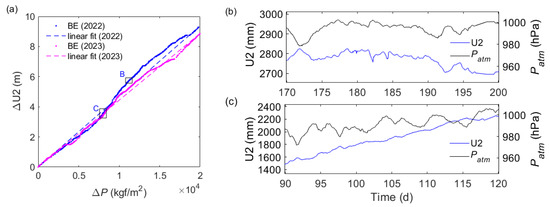(a) Barometric efficiency and (b,c) variations in the underground water level (U2, blue line) and atmospheric pressure (Patm, black line): (b)—asynchronous and (c)—disturbed.