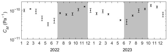 The obtained values of barometric efficiency were used to estimate the compressibility of the reservoir according to Equation (3). The compressibility of water-saturated rock manifests in pronounced season variations from 3.5 × 10−11 to 2 × 10−10 (Figure 4).