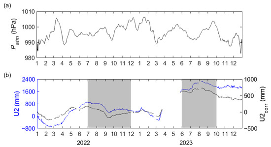 After the initial data were filtered from the effects of atmospheric pressure (Figure 5a), a decrease in piezometric surface was traced in the water level of the upper aquifer at the summer low water beginning from July 2022 and July 2023 (Figure 5b).