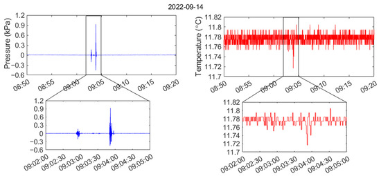 The effect of temperature decrease by 0.065 °C was fixed during the propagation of seismic waves produced by the explosion in the mine in a chamber located to the north-east from the observation point I down the underground flow at the reduced distance of 99 m/kg1/3 (Figure 7) and during the propagation of seismic waves of two explosions in the western side of the quarry in the depth interval from −165 m to −45 m (Figure 8). Variations in pressure in the “reservoir–well” system were 1.0 kPa and 1.6 kPa, respectively.