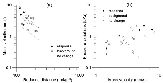 Thus, two types of coseismic effects were observed in processing the experimental data—water temperature increase and decrease, synchronous to the changes in pore pressure in the “reservoir–well” system. They all were observed during industrial explosions in the chambers of the mine and in the quarry. The relations between the reaction of the “reservoir–well” system and the parameters of industrial explosions show low coefficients of determination (Figure 10). The dependence of ground velocity on reduced distance is rather weak (Figure 10a). Values of ground velocity exceed the theoretical estimates made for explosions in the quarries of KMA [26]: