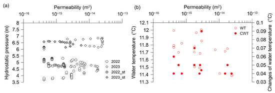 An increase in the range of variations in the permeability of water-saturated reservoir for the entire period of observations and for the period of quasi-stationary conditions was traced in anthropogenically disturbed conditions as the head rose by 3.7 m in 2023 in comparison to 2022 (Figure 11a). The value of the median permeability of the reservoir in 2022 was 1.5 × 10−15 m2. It increased to 2.7 × 10−15 m2 in 2023.