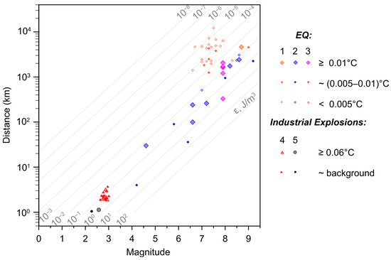 Distance–magnitude dependence for earthquakes (EQ) and industrial explosions at KMA. The diagonal grid shows variations in seismic energy density. The legend gives corresponding data on water temperature measurements in aquifers (coseismic and post-seismic changes) (1—Yang et al., 2007 [4]; 2—Zhang et al., 2023 [3]; 3—He, Singh, 2020 [7]; 4—mine; 5—quarry).