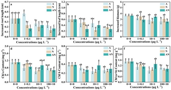 Variations in growth and photosynthetic characteristics of V. natans when exposed to CAA, NDMA, and their combination. Increased root length (a); Increased leaf length (b); Increased biomass (c); Contents of Chl a (d); Chl b (e); Chl (a + b) (f). Different lowercase letters such as a, b, c, and d indicate statistically significant differences between treatments (p < 0.05).