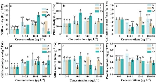 Variations in the V. natans leaf antioxidant system when exposed to CAA, NDMA, and their combination. SOD (a), POD (b), CAT (c), GSH (d), MDA (e), TP (f). Different lowercase letters such as a, b, c, and d indicate statistically significant differences between treatments (p < 0.05).