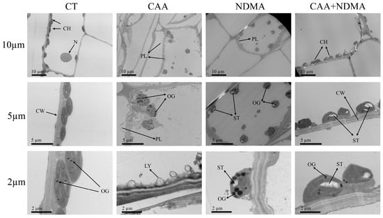 Variations in the ultrastructure of V. natans subjected to CAA and NDMA. Chloroplast (CH), nucleolus (N), plasmolysis (PL), cell wall (CW), osmiophilic granules (OG), starch (ST), and lysosomes (LY).
