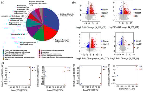 To better understand the impact of CAA and NDMA, individually and in combination, on V. natans at the molecular level, a non-targeted metabolomics approach was used to identify and quantify metabolites of V. natans using data from UHPLC-Q-TOF MS (Figure 4). In Supplementary Text S3, the assessment information for the quality control of the metabolomics experiment is provided. From a comprehensive screening, it was found that 542 metabolites were encompassed across various treatments, among which 61 were differentially expressed metabolites (VIP > 1, p < 0.05). These primarily consisted of lipids and lipid-like molecules (31.9%), organic heterocyclic compounds (16.6%), phenylpropanoids and polyketides (12.2%), benzene and substituted derivatives (11.3%), organic acids and derivatives (9.9%), organic oxides (5.5%), alkaloids and derivatives (4.6%), organic nitrogen compounds (4.2%), nucleosides, nucleotides, and analogs (2.9%), and lignans, neolignans, and related compounds (1.0%). In Figure 4b, the distinctions in metabolites between different samples are presented using a unified statistical analysis method. When compared to the control treatment, a greater number of metabolites were upregulated rather than downregulated in plants exposed to pollution, indicating that both single and combined pollutants significantly affected the metabolites in V. natans leaves to different extents. Orthogonal Projections to Latent Structures Discriminant Analysis (OPLS-DA) was used to examine inter-group differences through multiple principal component analyses (Figure 4c). In this study, the pollutant-treated group and control group were easily distinguished from one another. The first principal component (PC1) and the second principal component (OC2) explained 27.9% and 20.4% of the features of the original dataset, respectively, in the comparison of group A with the CT group. In the comparison of group N with the CT group, PC1 and OC2 explained 27.9% and 30.8% of the features of the original dataset. In the comparison between the AN group and the CT group, PC1 and OC2 explained 32.1% and 22.1% of the features of the original dataset, respectively. These results indicate that CAA and NDMA altered the quantity and types of metabolites in V. natans leaves.