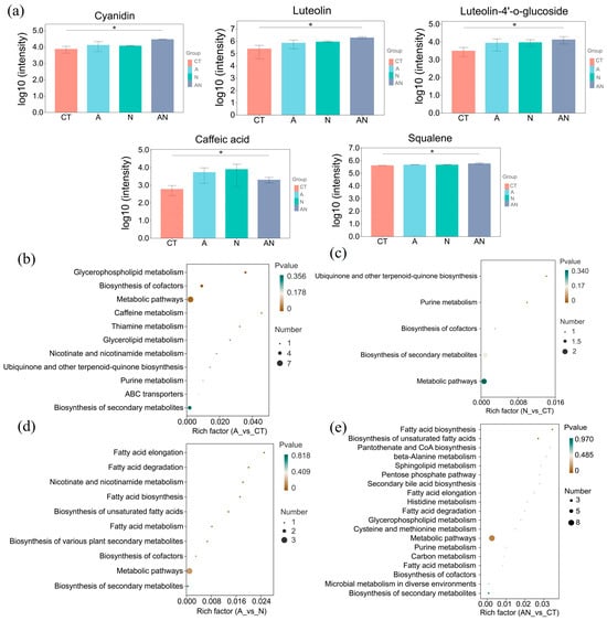 (a) Alterations in the essential antioxidant composition within V. natans leaves were observed. Between groups * indicates the significance of the difference between the four groups, p < 0.05. (b–e) Enrichment analysis of altered metabolites in V. natans leaves subjected to CAA and NDMA exposure. The X-axis denotes the rich factor, while the Y-axis signifies the pathway names. The size of the bubbles corresponds to the quantity of DEGs involved, and the closer the bubbles are to brown, the higher the degree of enrichment in metabolic pathways.