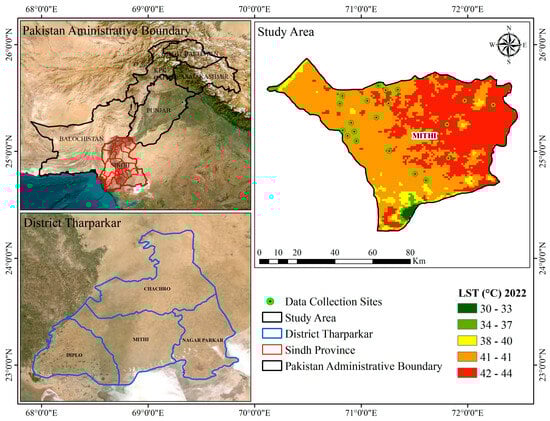 Pakistan, particularly the provinces of Sindh and Balochistan, is located in an arid to semi-arid climatic zone, making it highly susceptible to drought [28]. The increased temperature and low average annual rainfall exacerbate this vulnerability, particularly in the major deserts of Thar, Thal, Cholistan, and Chagi-Kharan. These areas are persistently prone to drought conditions, which have become more frequent due to pollution and climatic changes [49,50]. The province of Sindh receives only 20% of its annual rainfall during the monsoon period from June to September, with an annual average of less than 300 mm. Winter rainfall is almost negligible [36]. In 2014, Tharparkar, a district in Sindh, was severely affected by drought, resulting in significant devastation. Reports indicated 182 deaths among children under five and 149 adult deaths (91 males and 58 females), along with widespread epidemics, dehydration, malnutrition, and fever/malaria [30,49]. Additionally, 4446 children and 3910 adults suffered from abdominal issues, diarrhoea, and fever/malaria for unknown reasons [28]. According to the Sindh Relief Department, Tharparkar has been declared a calamity-hit district in 1968, 1978, 1985, 1986, 1987, 1995, 1996, 1999, 2001, 2004, 2005, 2007, and 2012. Tharparkar covers over 22,000 km2, making it the largest desert in Pakistan and the 18th largest globally [30,49]. The district’s population of 1.5 million people lives in 2300 villages and urban settlements across seven talukas: Mithi, Islamkot, Chachro, Kaloi, Dahli, Diplo, and Nagarparkar. Despite its arid conditions, the land is highly fertile but relies heavily on the rainfall from July to September. Unfortunately, Pakistan’s rainfall pattern is highly variable and increasingly affected by global warming [51].