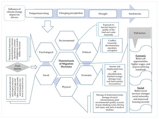 This conceptual framework aims to elucidate the connections between the major concepts and variables underpinning this study. By integrating theoretical ideas with empirical research, the framework provides a structured approach to understanding migration dynamics as an adaptation strategy in the context of drought induced by climate change (Figure 1).