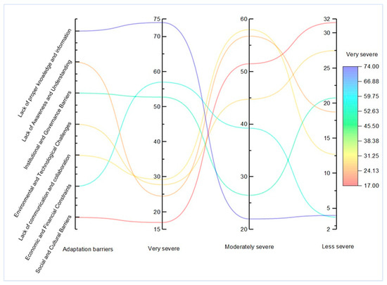Figure 4 identified the most common barriers to migration as an adaptation strategy, including lack of proper knowledge and information, lack of awareness and understanding, institutional and government barriers, environmental and technological challenges, lack of communication and collaboration, economic and financial constraints, and social and cultural barriers. Among these, 57%, 52.7%, and 74% of migrants found that economic and financial constraints, institutional and government barriers, and lack of proper knowledge and information were the most severe obstacles to developing resilient livelihoods. In this case, a respondent opined his/her perception as follows: