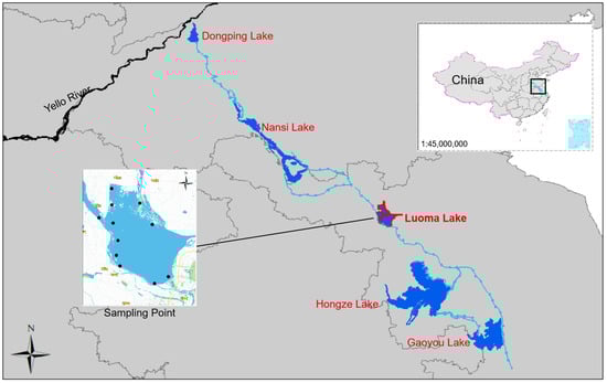 Luoma Lake is a typical water-carrying lake located in Jiangsu Province, spanning the cities of Xuzhou and Suqian (34°00′–34°11′ N, 118°04′–118°18′ E). The lake covers a total area of approximately 260 square kilometers, with a volume of about 920 million cubic meters and an average depth of 4.4 m, classifying it as a shallow lake (Figure 1). Compared to deep lakes, shallow lakes are more susceptible to external factors such as rainfall and runoff, which can influence the distribution of nutrients and pollutants, such as heavy metals. Additionally, seasonal temperature changes can rapidly affect the entire water body. In summer, shallow lakes may warm up more quickly, promoting the growth of algae and other plankton; in winter, the cooling effects are more evenly distributed across the entire water body. Luoma Lake is the seventh-largest freshwater lake in China and a crucial node in the eastern route of the South-to-North Water Diversion Project. Situated in the lower reaches of the Yishusi Basin, it receives inflows from the upper Nansi Lake, the mainstream of the Yi River, and the Pizhou–Cangshan area, covering approximately 58,000 square kilometers. As a vital flood control reservoir in the lower Yishusi Basin, Luoma Lake regulates water flow into and out of the lake, ensuring the smooth operation of the South-to-North Water Diversion Project. Over seven years, Luoma Lake has transferred a total of 4.61 billion cubic meters of water, serving as a primary input channel and storage reservoir for the project. In addition to its role in the water diversion project, Luoma Lake is an essential water source for the surrounding urban areas, including the Huang-Huai-Hai Plain and the Shandong Peninsula. Historical land reclamation activities have significantly reduced the lake’s surface area, leading to severe ecological pollution, especially heavy metal contamination. To ensure drinking water safety and restore the lake’s storage and regulatory functions, the retreating polder initiative involved removing embankments and aquaculture enclosures across 49.5 square kilometers. This effort cleared approximately 25.33 square kilometers of nets and cages, excavated around 35.33 square kilometers of dikes, and restored about 30 square kilometers of open water surface, thereby reducing nitrogen and phosphorus pollution and enhancing the lake’s water mobility and self-purification capacity.
