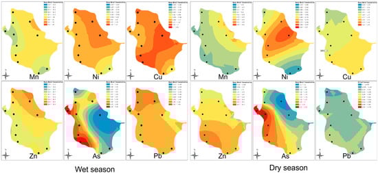 GIS technology is widely applied in environmental science, particularly in water quality monitoring. It allows for the visualization of discrete sampling data to illustrate spatial water quality distribution []. In this study, GIS combined with ordinary kriging interpolation was used to map the concentration distribution of Mn, Ni, Cu, Zn, As, and Pb in Luoma Lake during the rainy season (July) and dry season (December) (Figure 2). The figure indicates that heavy metal concentrations were higher in the northern and eastern regions during the wet season, but these levels decreased in the dry season. This pattern is likely related to surface runoff and precipitation. During the wet season, increased rainfall and surface runoff transport pollutants into the lake, whereas during the dry season, the reduced input of pollutants allows the lake’s self-purification capacity to become more evident. This also suggests that the restoration of the lake’s natural state has had a progressively more significant impact over time [].