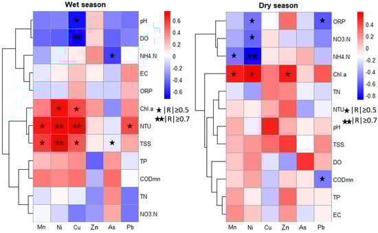 The study of correlations between heavy metals and water quality indicators during the wet and dry seasons in Luoma Lake (Figure 3) revealed significant temporal and spatial variations. In the wet season, Mn, Ni, Cu, Zn, and Pb exhibited strong correlations with most water quality indicators, particularly with NTU, TSS, and CODmn. These heavy metals were negatively correlated with DO and pH, with the correlation being stronger for DO. This indicates that heavy metal pollution during the wet season is likely closely linked to water turbidity and suspended solids content, and the decrease in dissolved oxygen is also a contributing factor to the increase in heavy metal concentrations []. In the dry season, Mn displayed significant negative correlations with DO, ORP, and NTU, suggesting that the dissolved oxygen levels and redox state of the water significantly influence the behavior and distribution of heavy metals. With reduced water mobility in the dry season, heavy metals are more prone to settling and accumulation, particularly under poor redox conditions []. Zn had significant positive correlations with TN and NTU, indicating that Zn pollution is closely associated with nutrient content and water turbidity. As exhibited a significant positive correlation with ORP, suggesting that the form and concentration of As in the water may be influenced by the redox environment.