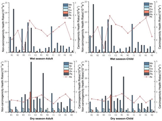 According to the evaluation methods and health assessment models published by the EPA of the US, heavy metals in water bodies primarily expose humans through drinking water and skin contact [,]. Human health risks are assessed for both adults and children and are categorized into chemical carcinogenic risks and non-carcinogenic risks [].
