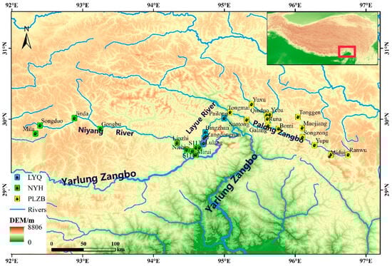 The study area is located in the southeastern part of the TP, predominantly within Nyingchi City in the Tibet Autonomous Region. It lies at the junction of the Nyainqêntanglha Mountains and the Himalayas and is characterized by significant topographic variation. The highest peak, Namcha Barwa, reaches 7782 m, while the lowest points are just a few hundred meters above sea level. The SETP contains the largest distribution of maritime glaciers in China, but it is experiencing severe loss [,,]. The Layue River (LYR), Niyang River (NYR), and Palong Zangbo (PLZB) all belong to the YLZBR system (Figure 1). This study area is directly exposed to the water vapor channel of the YLZBR, with a climate predominantly influenced by the Indian monsoon and the westerlies [,]. The region exhibits a significant vertical climate gradient across its mountains. From June to September, the Indian monsoon carries large amounts of moisture from the Bay of Bengal through the YLZBR valley into the central and eastern parts of the plateau, forming the well-known “warm tongue” and “wet tongue” on the plateau [,,,]. Mon-soon precipitation not only alters the distribution pattern of precipitation at different elevations within the region but also concentrates during the monsoon phase, with more than 70% of the annual precipitation occurring from June to September [,]. According to records from the Nyingchi Station of the National Meteorological Bureau over the past 60 years, the average annual temperature in Nyingchi is 8.9 °C, with an average annual precipitation of 680.8 mm.