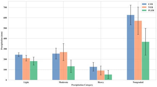 From 2013 to 2018, the average monsoon precipitation at the seven stations in the LYR catchment ranged between 493.3 mm and 790 mm, with a mean of 621.7 ± 95.1 mm, the highest among the three catchments (Figure 4). In the NYR catchment, the average monsoon precipitation at the 11 stations for the same period was 571.3 ± 131.7 mm. The PLZB catchment, with data from 14 stations recorded from 2014 to 2018, had the lowest average precipitation of the three catchments, with a mean of 368.4 ± 129.7 mm. PLZB also exhibited the lowest average precipitation across all precipitation intensities. Among the three catchments, LYR had the highest average precipitation for light and heavy rain events, followed by NYR. However, for moderate rain intensity, NYR slightly exceeded LYR in average precipitation.