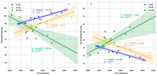 Regression of rainfall days (a) and no rainfall days (b) with elevation in the river catchments of the SETP (**: p ≤ 0.01 ).