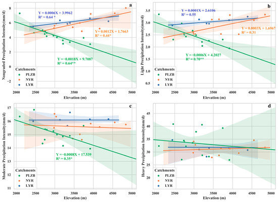 The relationship between precipitation intensity and elevation across different rain levels for the three study catchments (*: p ≤ 0.05,**: p ≤ 0.01 ). (a–d) represent nongraded precipitation, light precipitation, moderate precipitation, and heavy precipitation, respectively.