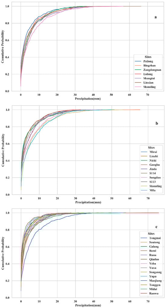 Distribution of cumulative precipitation frequency at each station within the catchment: (a) LYR, (b) NYR, and (c) PLZB.