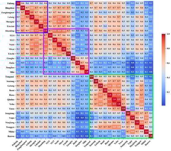The correlation matrix (R2) of daily precipitation at each station in the SETP. The blue box represents LYR, the purple box represents NYR, and the green box represents PLZB.