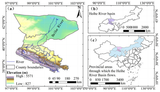 Overview map of the study area. (a): Schematic diagram of the Heihe River Basin; (b): Diagram of the provinces in which the Heihe River Basin is located; (c): Diagram of the geographic location of the Heihe River Basin in China.