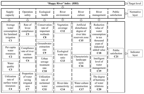 To develop an effective happy river evaluation system, we not only need to consider the objective factors of water environment, water safety, and water ecology, but also to add the residents’ satisfaction with the construction of the ‘happy river’ to the evaluation system, but also to introduce the normative systems related to the sustained and healthy development of rivers and lakes, the construction of facilities, the subjective evaluation of the residents and other subjective elements. In accordance with the “Nanjing Happy River and Lake Evaluation Standards (Trial)”, “Evaluation Guidelines for the Construction of Water Ecology Civilisation Cities” [24], and “Guidelines for Evaluation of Water Use Indicators” [25], along with the research findings of previous scholars [26,27,28,29], we establish an evaluation hierarchy consisting of “target-criteria-indicator”. This involves determining the threshold value for each indicator and calculating the Happy River Index (HRI) [10]. The evaluation system positions the HRI as the target level, while the normative level encompasses the supply capacity (B1), operational safety (B2), ecological health (B3), river environment (B4), river culture (B5), river management (B6), and public satisfaction (B7) concerning the river and lake water resources within the river basin. The system includes indices for supply capacity (I1), operational safety (I2), ecological health (I3), river environment (I4), river culture (I5), river management (I6), and satisfaction (I7). Following the principle of “single-indicator quantification-multiple-indicator synthesis-multiple-criteria integration” (SMI-P), the indicator layer of the evaluation system is constructed by selecting indicators that are representative, scientific, comprehensive, and easily accessible. This layer comprises a total of 21 positive indicators (where a higher value is preferable) and negative indicators (where a lower value is preferable). The specific structure of the evaluation system is illustrated in Figure 2, while the indicators and the evaluation framework are detailed in Table 1.