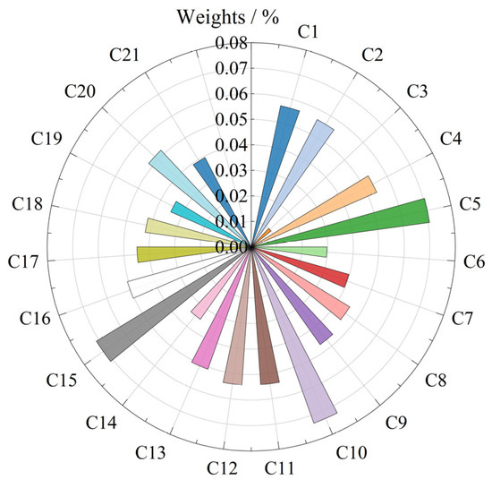 Based on the Entropy Weighting method, the five evaluation indicators with the highest weights are as follows: urban sewage treatment rate (C10) > artificial disturbance degree of river lake reservoir zone (C15) > levee compliance rate (C5) > average water consumption for farmland irrigation (C1) > per capita water resources (C2). Notably, most of these indicators are objective in nature. Conversely, the five indicators with the lowest ratings are: water quality (C3) < compliance rate of river section treatment (C6) < intelligent level of water management (C19) < river and lake connectivity (C14) < vegetation coverage (C21), where subjective and objective factors are largely consistent. The degree of good water quality (C3) is a critical evaluation index for the overall assessment, as it achieves a 100% rating annually; however, it lacks significant reference value for measuring the degree of ‘Happy River’ in Zhangye City. The urban sewage treatment rate (C10) has the highest evaluation weight, indicating that enhancing the city’s quality of life is the primary factor influencing the ‘happy river’ evaluation according to this method. This, in turn, indirectly determines public satisfaction and directly impacts the sense of well-being during the construction of the happy river and lake. The weights were calculated using the entropy weighting method, and the results of the optimized indicators are illustrated in Figure 3.