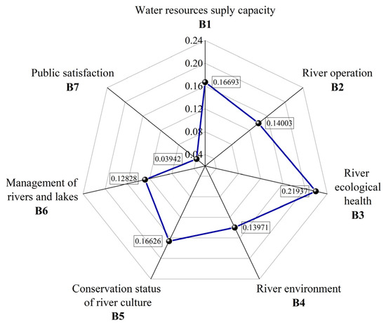 The weights of each criterion layer in the ‘Happy River’ evaluation system are illustrated in Figure 4. According to this evaluation system, the weights of the criteria layers are ranked as follows: river ecological health (B3) > water resources supply capacity (B1) > conservation status of river culture (B5) > operational efficiency (B2) > river environment (B4) > management of rivers and lakes (B6) > public satisfaction (B7). It is evident that river ecological health (B3), water resources supply capacity (B1), and conservation status of river culture (B5) are the primary factors influencing residents’ well-being in the context of rivers and lakes. This prominence arises from the significant contradiction between water demand and water supply for human social development in the Hexi Oasis. Residents’ demand for water primarily emphasizes the necessities for production and daily life, with a focus on the benefits derived from water resources. Subsequently, considerations extend to the living environment, before finally addressing the demand for water culture and other water-related functions. Therefore, the construction of the ‘Happy River’ initiative in Zhangye City should prioritize enhancing the subjective happiness of residents through the expansion of river and lake water function services.