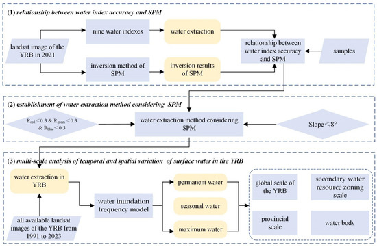 Figure 6 presents the technical framework of this study, which consists of three parts: (1) analyze the relationship between the water index extraction accuracy and SPM concentration. Nine typical water indexes are selected for comparative analysis of their applicability in the YRB, and the correlation between the extraction accuracy of these indexes and SPM concentration is examined. (2) Establish a water extraction method considering the SPM concentration (SWE-CSPM). The SWE-CSPM is constructed according to the principle of classification and grading. Spectral characteristics and terrain slope are used for post-processing. (3) Multi-scale dynamic monitoring of surface water in the YRB. The surface water dataset of the YRB from 1991 to 2023 is made using the SWE-CSPM, and the water inundation frequency (WIF) model serves as an indicator to divide permanent, seasonal, and maximum water year by year. The dynamic changing characteristics of the surface water are analyzed from the global scale, the secondary water resource zoning scale, the provincial scale, and the typical water scale.