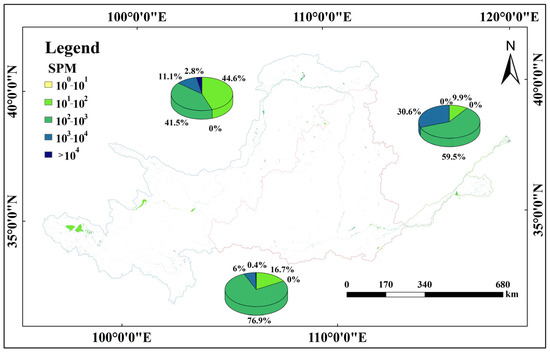 Figure 7 shows the spatial distribution of the SPM concentration in the surface water of the YRB in 2021. Statistical analysis indicates that the water in the lower reaches has the highest SPM concentration (average 970 mg/L), followed by that in the middle reaches (average 700 mg/L), and the water in the upper reaches has the lowest concentration (average 630 mg/L).
