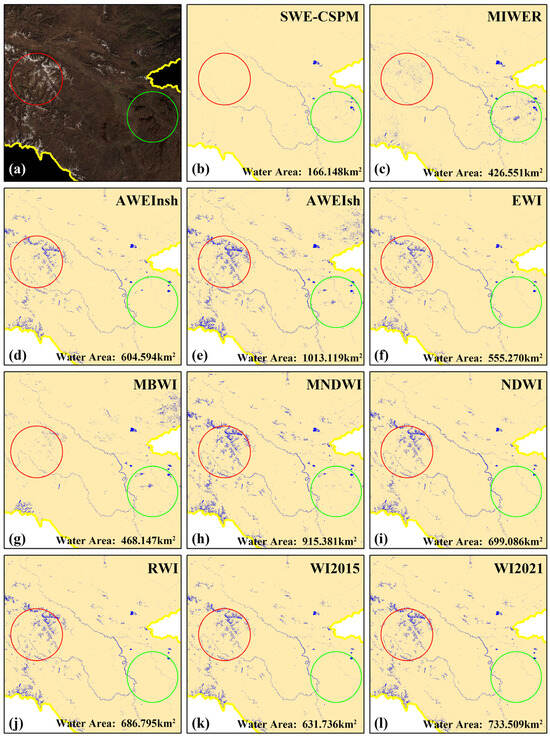 Surface water extraction of various methods in high mountain regions. The red circle is the area of ice–snow and the green circle is the area of shadow. (a) Landsat 8 true colour images of the area. (b–l), respectively the extraction effect of SWE-CSPM MIWER, AWEInsh, AWEIsh, EWI, MBWI, MNDWI, NDWI, RWI, WI2015 and WI2021.