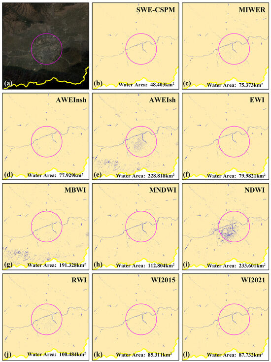 Surface water extraction of various methods in urban areas. The purple circle is the area of buildings. (a) Landsat 8 true colour images of the area. (b–l), respectively the extraction effect of SWE-CSPM MIWER, AWEInsh, AWEIsh, EWI, MBWI, MNDWI, NDWI, RWI, WI2015 and WI2021.