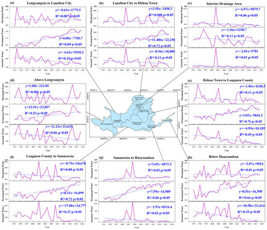 Surface water area changes in maximum, permanent, and seasonal surface water for each secondary water resource zoning (1991–2023). (a–h) respectively represent the three statistical water areas in Longyangxia to Lanzhou City, Lanzhou City to Hekou Town, Interior Drainage Area, Above Longyangxia, Hekou Town to Longmen County, Longmen County to Sanmenxia, Sanmenxia to Huayuankou and Be-low Huayuankou.