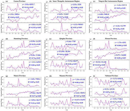 Surface water area changes in maximum, permanent, and seasonal surface water areas for the nine provinces within the YRB. (a–i) respectively represent the three statistical water areas in Gansu Province, Inner Mongolia Autonomous Region, Ningxia Hui Autonomous Region, Shandong Province, Qinghai Province, Henan Province, Shanxi Province, Shaanxi Province and Sichuan Province.