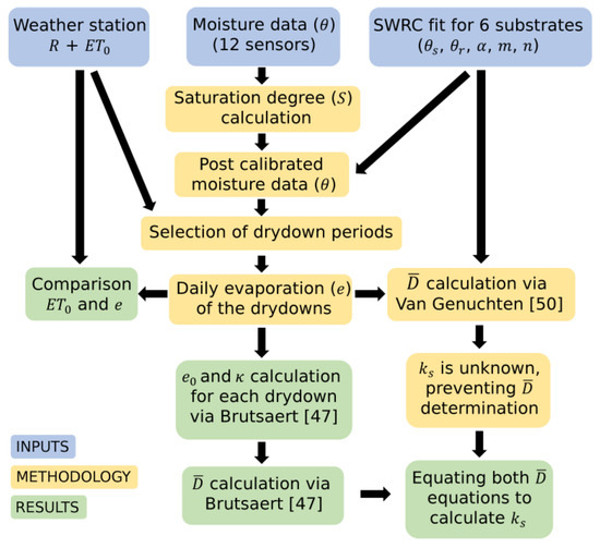 Conceptual figure of the road map followed for calculations. Symbols used in this figure are rainfall (R), reference evapotranspiration (ETo), soil moisture (θ), soil saturation degree (S), evaporation (e), the reference evaporation rate (e0) and time (κ) from the Brutsaert [47] method, as well as, weighted-mean diffusivity (), saturated hydraulic conductivity (), and the soil water retention curve (SWRC) with its correspondent values of residual water content (θr), saturated water content (θs), a scaling parameter (α), and shape parameters (m, n).