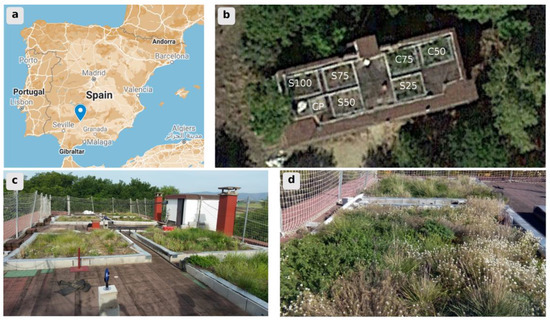 Location and appearance of the six green roof plots and the reference plot installed on a building of the University of Cordoba. (a) Location on the map, and (b) situation on the roof of the building [53] and plot identification. (c,d) Appearance of the plots.