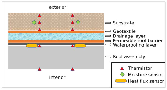 Water content and temperature were monitored every 15 min with (i) two Campbell CS616 moisture sensors and (ii) ten Campbell 107 thermistors in each plot. The aim was to characterize through different studies the water and energy balances, and the efficiency of different substrate mixtures to reduce the impact of incoming radiation into the building underneath. The sensors’ arrangement in and the schematic cross-section of each plot are shown in Figure 3.