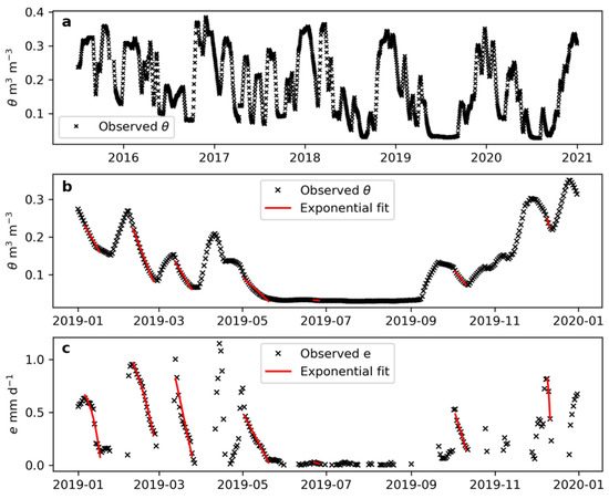 (a) Evolution of moisture for the west moisture sensor of plot C75, (b) observed moisture for the same sensor in one year, 2019, and (c) obtained daily evaporation for the same year and sensor. In b and c, the red lines show the exponential fits of the 7 drydown periods identified.