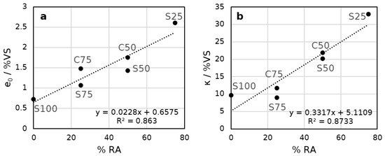 (a) Reference evaporation (e0) normalized with the fraction of vegetative substrates and compared with the fraction of recycled aggregates. (b) Reference time (κ) normalized with the fraction of vegetative substrates and compared with the fraction of recycled aggregates.