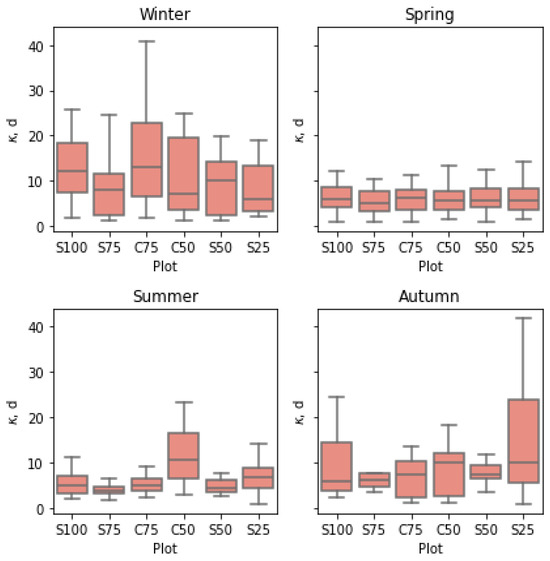 Box-and-whisker plots representing the variation in the estimates for the Brutsaert reference time (κ) differentiated by plot and season. The central horizontal bar in each rectangle represents the median value, the horizontal bars at the rectangles’ upper and lower boundaries are the values of the first (Q1) and third quartile (Q3), and the whiskers extend from the smallest to the largest values within 1.5 times the interquartile range (IQR), which is the range between the first quartile and third quartile.