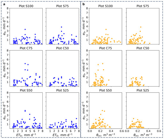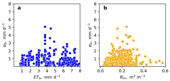 Variation in each plot from the reference evaporation rate by Brutsaert () with (a) the computed potential evaporation rate from the agrometeorological station (ETo) and with (b) the initial substrate moisture at the onset of the evaporation processes ().